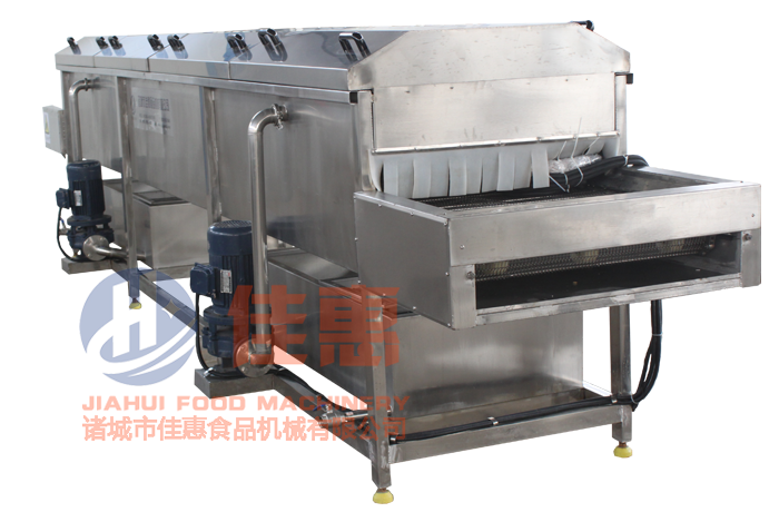 1、設(shè)備采用優(yōu)質(zhì)SUS304不銹鋼制作,符合國家食品出口標(biāo)準(zhǔn)。采用高壓噴淋清洗,清洗能力大、洗凈率高且不損傷物料,特別適合嬌嫩蔬果、雜質(zhì)多、難去除的食品清洗,可與篩板、網(wǎng)帶式氣泡清洗機(jī)組合使用。 2、隧道式高壓噴淋清洗機(jī)特別適合于大姜的清洗,在大姜清洗流水線中是不可缺少的一部分。大姜清洗流水線主要是由氣泡清洗段、高壓噴淋清洗段、成品挑選去雜段等組成,廣泛適用于國內(nèi)各生姜出口廠家。物科通過氣泡清洗段,刷洗生姜表面的大部分泥沙,自動(dòng)提升到高壓清洗環(huán)節(jié),進(jìn)行生姜的徹底清洗,噴淋段采取可調(diào)節(jié)噴頭,控制噴頭出水量,更好的保護(hù)生姜表皮,達(dá)到產(chǎn)品出口要求。 設(shè)備示意圖: